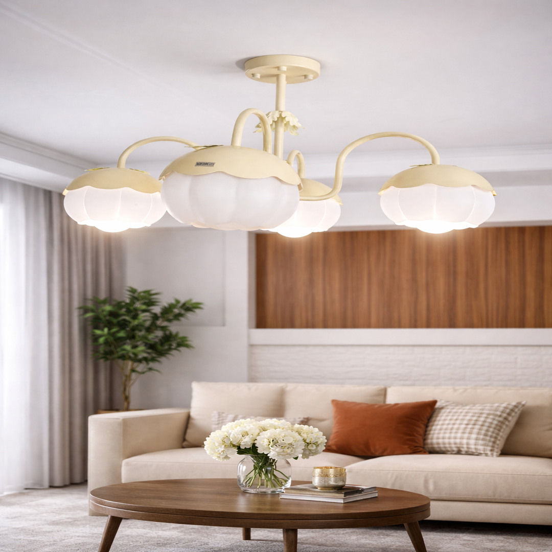 Featuring four soft-glow frosted glass shades shaped like delicate flowers, this chandelier creates a cozy and inviting ambiance, perfect for living rooms, bedrooms, dining areas, or boutique spaces.