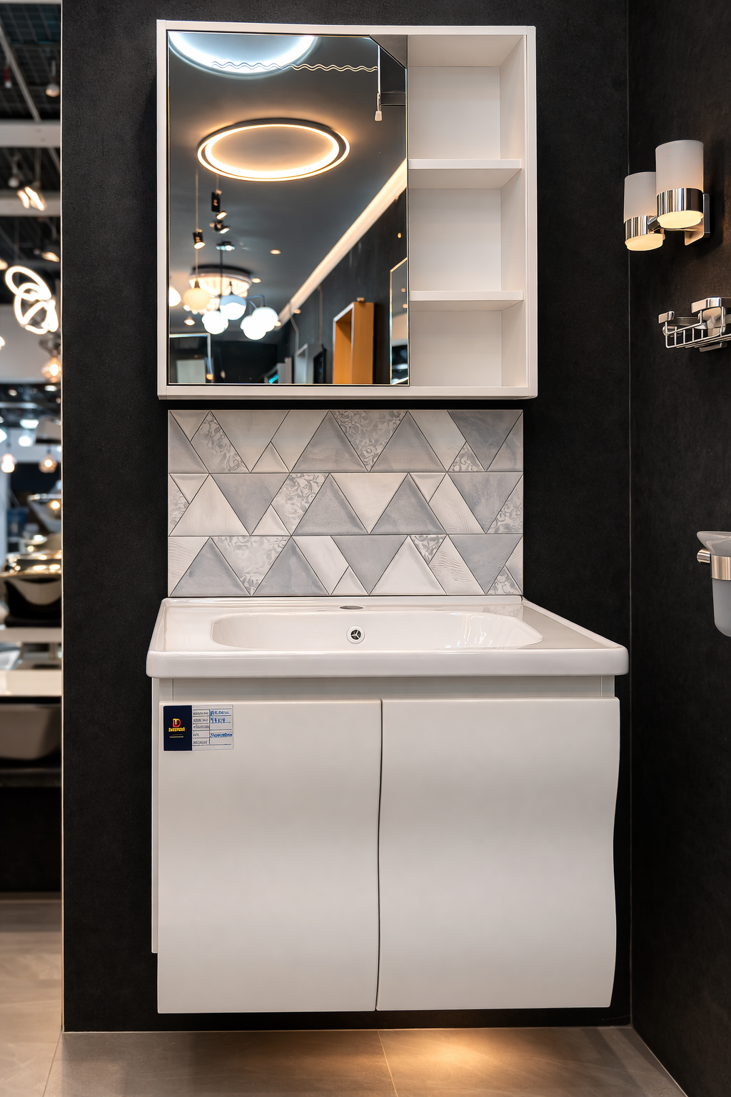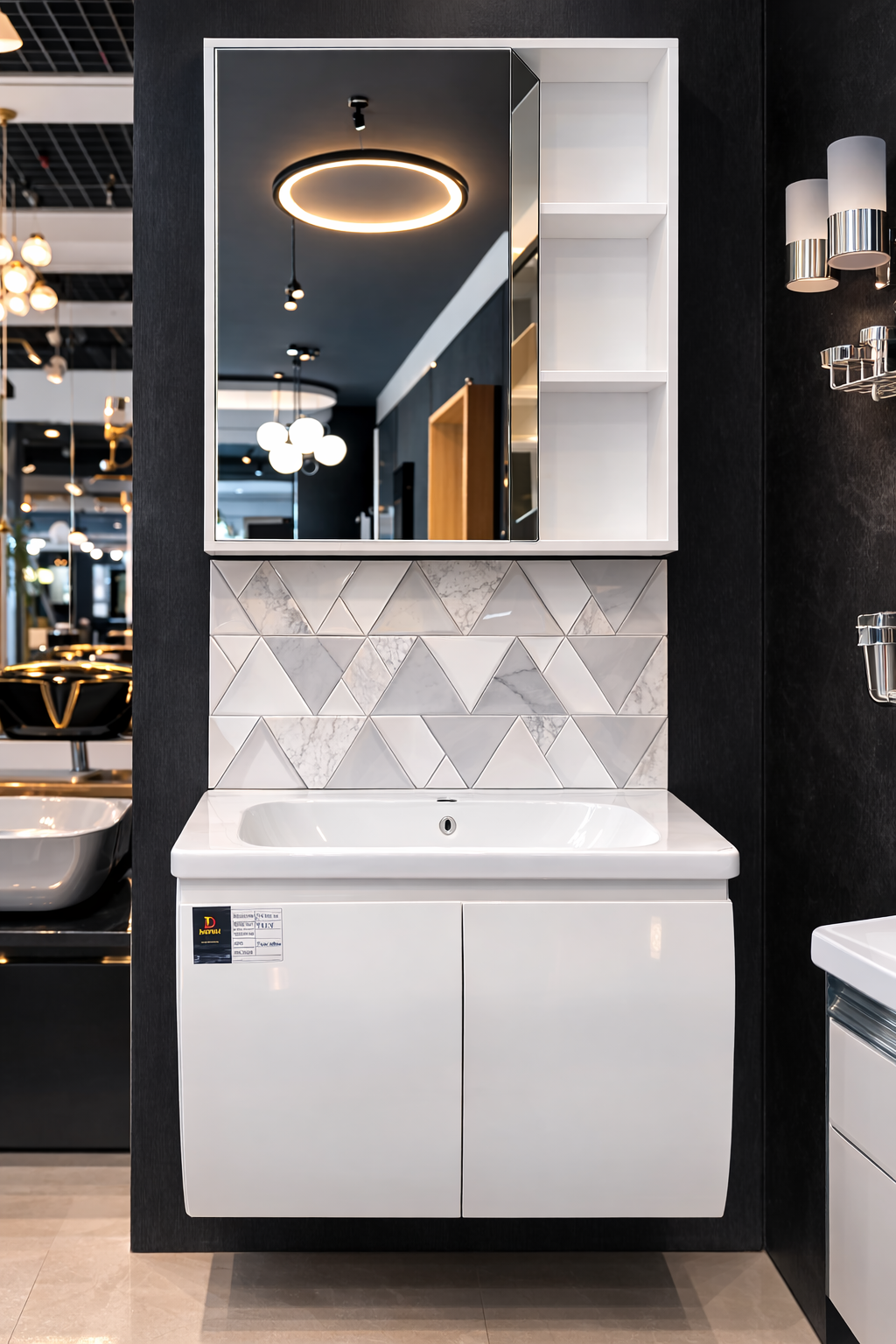 The minimalist design is enhanced by a geometric tile backdrop, giving your space a modern and sophisticated look. The wall-mounted structure not only saves floor space but also makes cleaning easier.