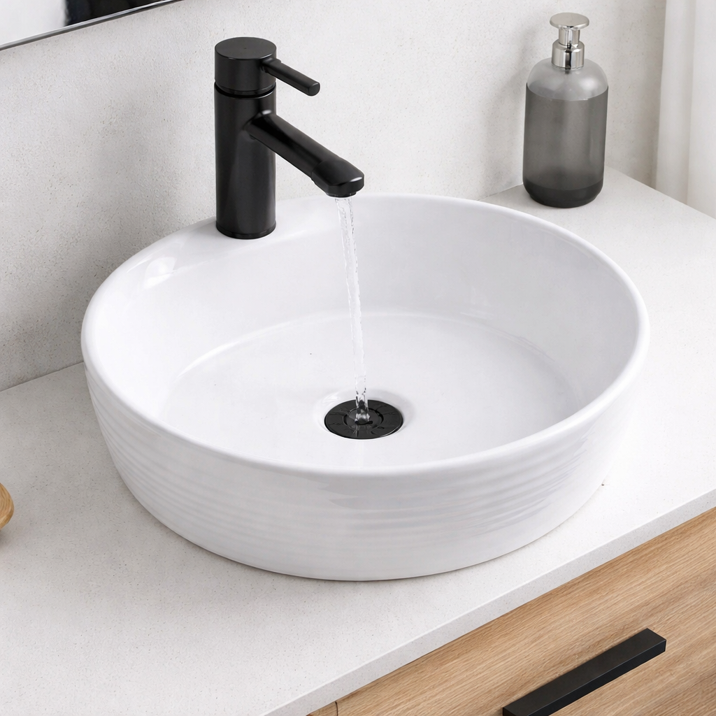 Manufactured from high-quality ceramic, the basin is resistant to stains, scratches, and discoloration, ensuring long-lasting beauty even with daily use. Its countertop installation design makes it ideal for residential bathrooms, hotels, offices, and commercial washrooms, allowing it to pair seamlessly with wall-mounted or countertop faucets.